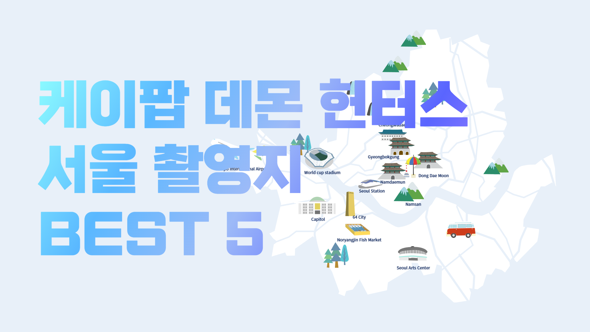 🎧 케이팝 데몬 헌터스 서울 촬영지 베스트 5 + 음악1. 🛸 올림픽주경기장 - 'How It's Done'강렬한 오프닝 무대가 펼쳐진 서울 송파구 올림픽주경기장! 실제 K팝 공연장으로도 유명해 현장감이 살아있습니다. 2. 📺 삼성역 전광판 - 'Golden'강남 삼성역 코엑스 앞 대형 전광판, ‘Golden’ 뮤직비디오 상영 장소로 유명한 곳입니다. 박기영 'Golden' 커버 곡 입니다. 3. 🍚 명동 길거리 + 국밥집 - 'Soda Pop'사자보이즈 버스킹 무대와 서울 명동의 따뜻한 길거리 음식 문화가 만나는 공간입니다. 4. 🌆 북촌 한옥마을 - 'Free'루미와 진우가 감정을 나눈 고즈넉한 북촌 한옥마을에서 ‘Free’ 명장면이 탄생했습니다. 5. 🗼 남산서울타워 - 'Your I..